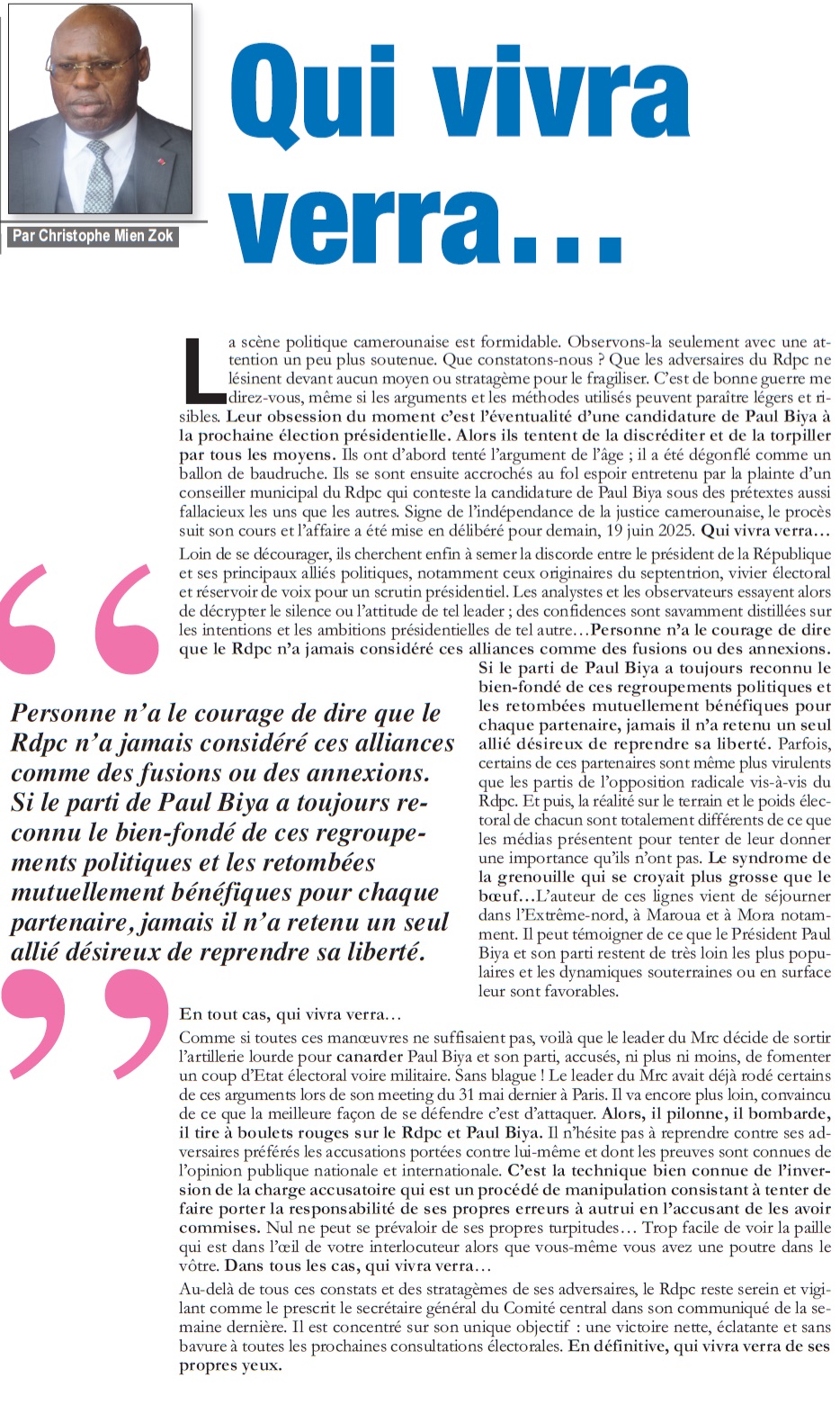 Au-delà de tous ces constats et des stratagèmes de ses adversaires, le Rdpc reste serein et vigilant comme le prescrit le secrétaire général du Comité central dans son communiqué de la semaine dernière. Il est concentré sur son unique objectif : une victoire nette, éclatante et sans bavure à toutes les prochaines consultations électorales. En définitive, qui vivra verra de ses propres yeux.
