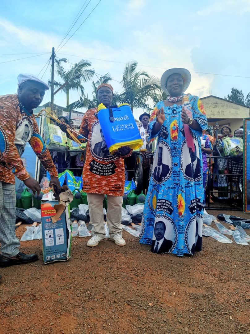 Quatre porte-tous, trente paires de bottes, 8 sacs d’engrais, 30 machettes, 8 pulvérisateurs, 20 arrosoirs et 50 paires de gants. Tel est en substances le contenu du don en matériel de travail agricole de haute facture remis aux militants le 22 juin dernier à Kouogouo-Ville. A cela, s’ajoute le don de 15 paires de bottes et 15 machettes remis à la communauté Bororo de Bafoussam, dans le cadre de la promotion économique des minorités et du vivre-ensemble.