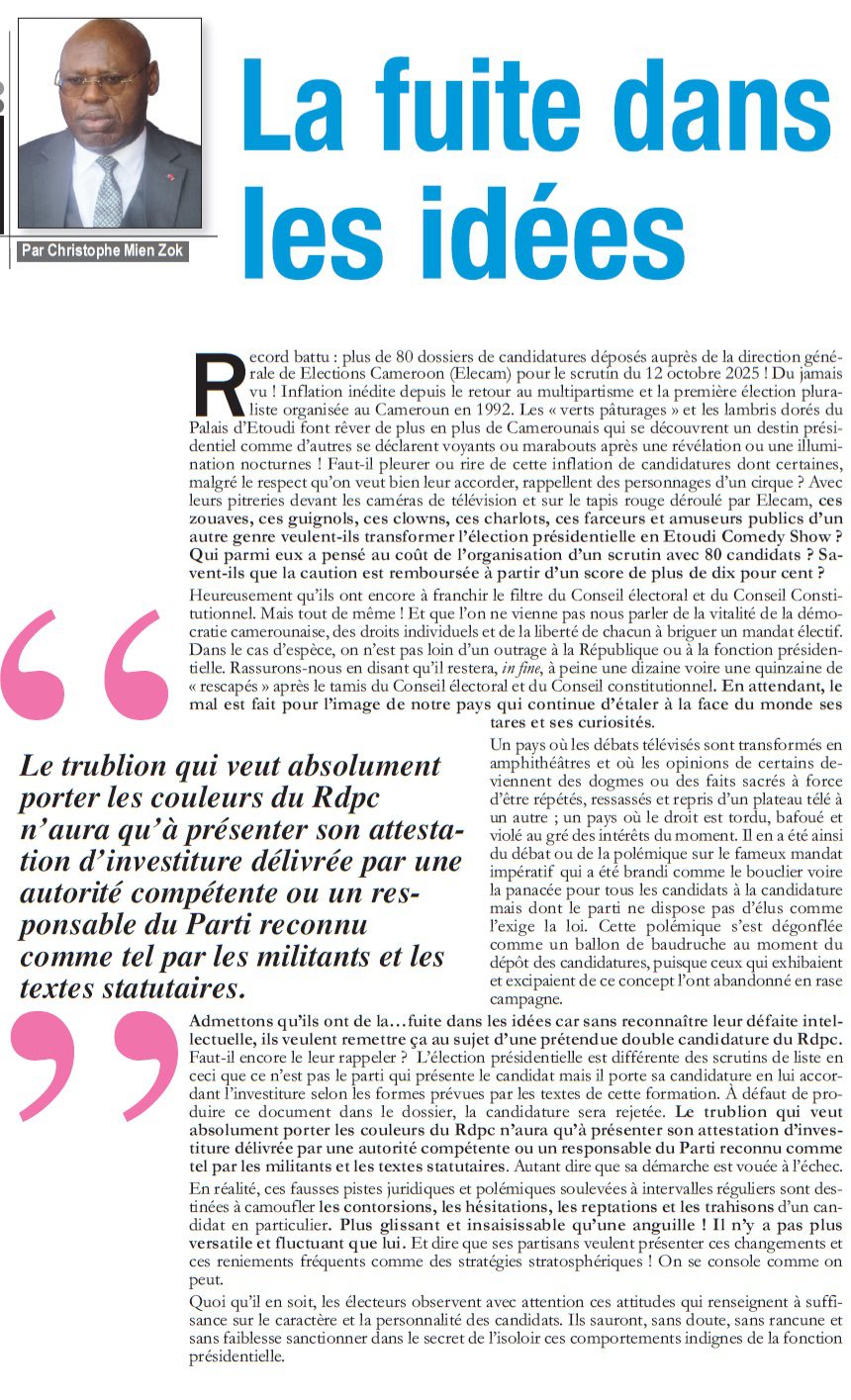 Record battu : plus de 80 dossiers de candidatures déposés auprès de la direction générale de Elections Cameroon (Elecam) pour le scrutin du 12 octobre 2025 ! Du jamais vu ! Inflation inédite depuis le retour au multipartisme et la première élection pluraliste organisée au Cameroun en 1992. Les « verts pâturages » et les lambris dorés du Palais d’Etoudi font rêver de plus en plus de Camerounais qui se découvrent un destin présidentiel comme d’autres se déclarent voyants ou marabouts après une révélation ou une illumination nocturnes ! Faut-il pleurer ou rire de cette inflation de candidatures dont certaines, malgré le respect qu’on veut bien leur accorder, rappellent des personnages d’un cirque ? Avec leurs pitreries devant les caméras de télévision et sur le tapis rouge déroulé par Elecam, ces zouaves, ces guignols, ces clowns, ces charlots, ces farceurs et amuseurs publics d’un autre genre veulent-ils transformer l’élection présidentielle en Etoudi Comedy Show ? Qui parmi eux a pensé au coût de l’organisation d’un scrutin avec 80 candidats ? Savent-ils que la caution est remboursée à partir d’un score de plus de dix pour cent ?