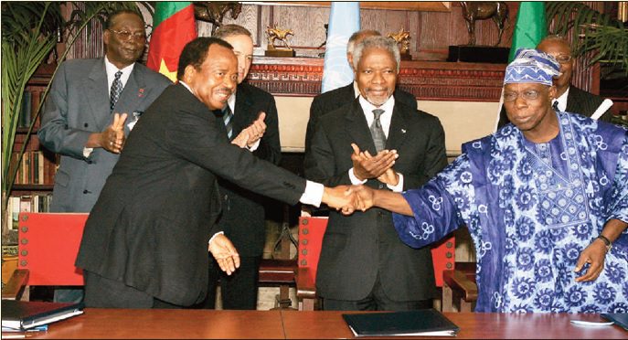 au Cameroun de PaulBiya, suite aux accords de Greentree en août 2006. Une fois de plus, l’option choisie par le sage africain aura été la meilleure, car ayant permis d’épargner la vie de nombreux soldats des deux côtés de la frontière, forçant l’admiration du monde entier, à commencer par Koffi Annan, le secrétaire général de l’Organisation des Nations unies (Onu) d’alors.