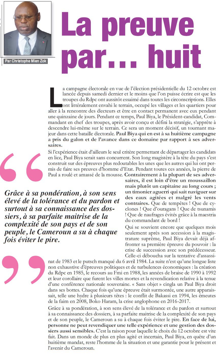 Grâce à sa pondération, à son sens élevé de la tolérance et du pardon et surtout à sa connaissance des dossiers, à sa parfaite maitrise de la complexité de son pays et de son peuple, le Cameroun a su à chaque fois éviter le pire. En face de lui, personne ne peut revendiquer une telle expérience et une gestion des dossiers aussi sensibles. C’est la raison pour laquelle le choix du 12 octobre est vite fait. Dans un monde de plus en plus agité et incertain, Paul Biya, en quête d’un huitième mandat, reste l’homme de la situation et une garantie pour le présent et l’avenir du Cameroun.