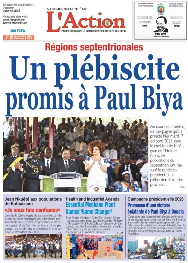 C’est dans une atmosphère d’unité, de ferveur et de loyauté que la maison du Parti de Bonanjo a accueilli hier un meeting exceptionnel du Rdpc, sous la présidence de Jean Nkuété, Secrétaire général du Comité central, Coordonnateur national de la campagne du candidat du Parti, Paul Biya. P. 4