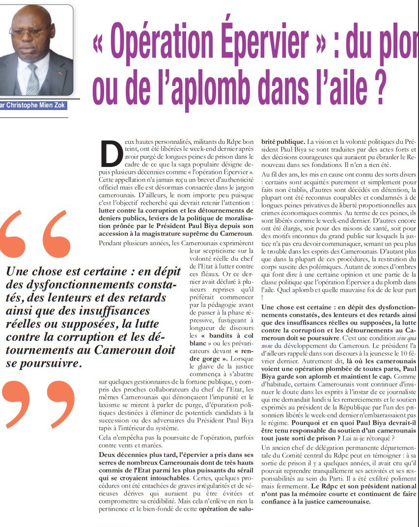 Deux hautes personnalités, militants du Rdpc bon teint, ont été libérées le week-end dernier après avoir purgé de longues peines de prison dans le cadre de ce que la saga populaire désigne depuis plusieurs décennies comme « l’opération Épervier ». Cette appellation n’a jamais reçu un brevet d’authenticité officiel mais elle est désormais consacrée dans le jargon camerounais. D’ailleurs, le nom importe peu puisque c’est l’objectif recherché qui devrait retenir l’attention : lutter contre la corruption et les détournements de deniers publics, leviers de la politique de moralisation prônée par le Président Paul Biya depuis son accession à la magistrature suprême du Cameroun.