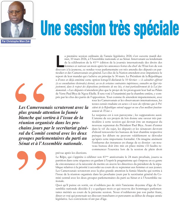 La première session ordinaire de l’année législative 2026 s’est ouverte mardi dernier, 10 mars 2026, à l’Assemblée nationale et au Sénat. Intervenant au lendemain de la célébration de la 41ème édition de la journée internationale des droits des femmes et surtout un mois après les annonces fortes du chef de l’Etat lors de son discours à la jeunesse, ce rendez-vous parlementaire est très attendu des députés en particulier et des Camerounais en général. Les élus de la Nation attendent avec impatience le report de leur mandat qui s’achève en principe le 30 mars. Le Président de la République a d’ores et déjà entériné cette option lorsqu’il déclarait le 10 février : « le calendrier afférent (à ces consultations électorales) devrait, au vu de certaines contraintes impérieuses, connaître un léger réajustement, dans le respect des dispositions pertinentes de nos lois, et tout particulièrement de la Loi fondamentale. » Les députés n’attendent plus que le projet de loi prorogeant leur bail au Palais de Verre Paul Biya de Ngoa-Ekelle. Il sera voté à l’unanimité par la chambre entière, y compris par les élus des partis de l’opposition. Tout comme ils attendent impatiemment, avec tous les Camerounais et les observateurs internationaux, les textes censés traduire en actes « le sens des réformes que le Président de la République entend engager en vue d’un meilleur fonctionnement de l’Etat. »